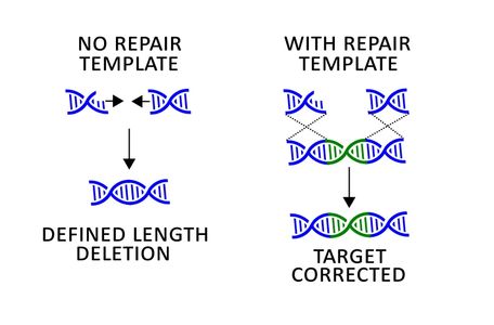 Depending on the presence or absence of template DNA, the cell may introduce defined length deletions (no template) or increase the frequency of repair (with template).